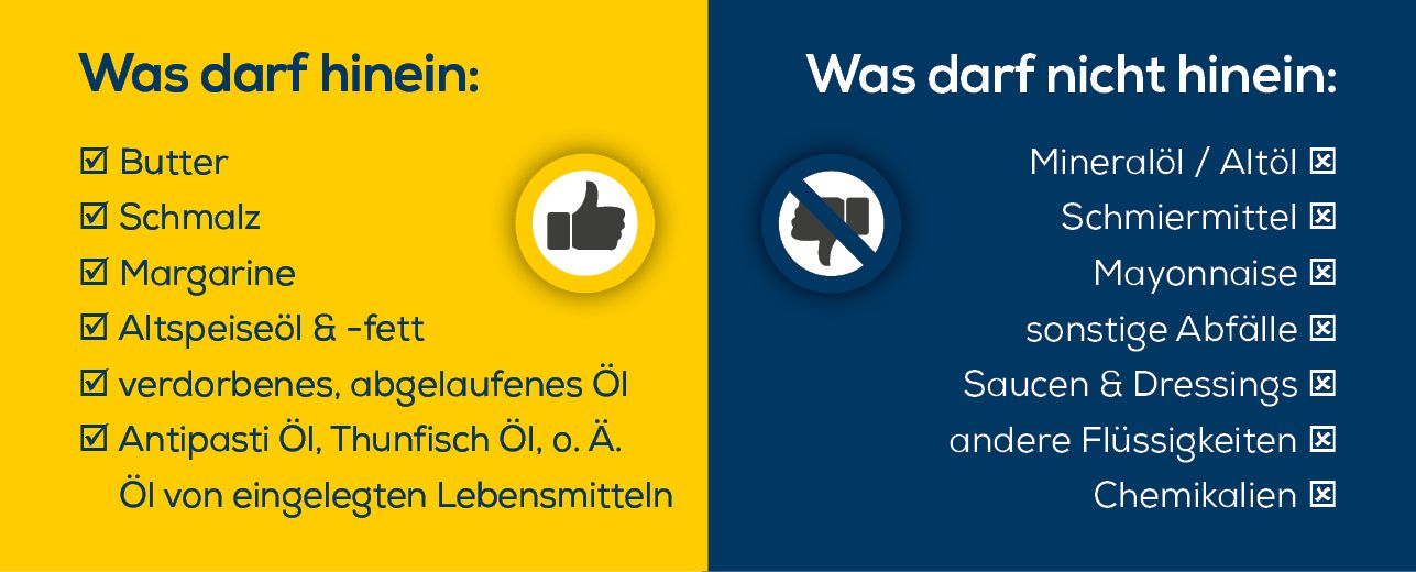 Es ist bedauerlich, dass nach wie vor eine beträchtliche Menge an Altspeiseöl und -fett unsachgemäß über den Kanal entsorgt wird, was zu Störungen in den Abwassersystemen führt. Die Einführung der Fett-BehÖLter bietet den Menschen in Niederösterreich neben dem NÖLI eine zusätzliche Möglichkeit, Altspeiseöl und -fett korrekt zu entsorgen. Erlaubt sind ausschließlich Altspeiseöle und -fette. Mineralöle, Schmiermittel und Chemikalien gehören keinesfalls in die Fett-BehÖLter.
